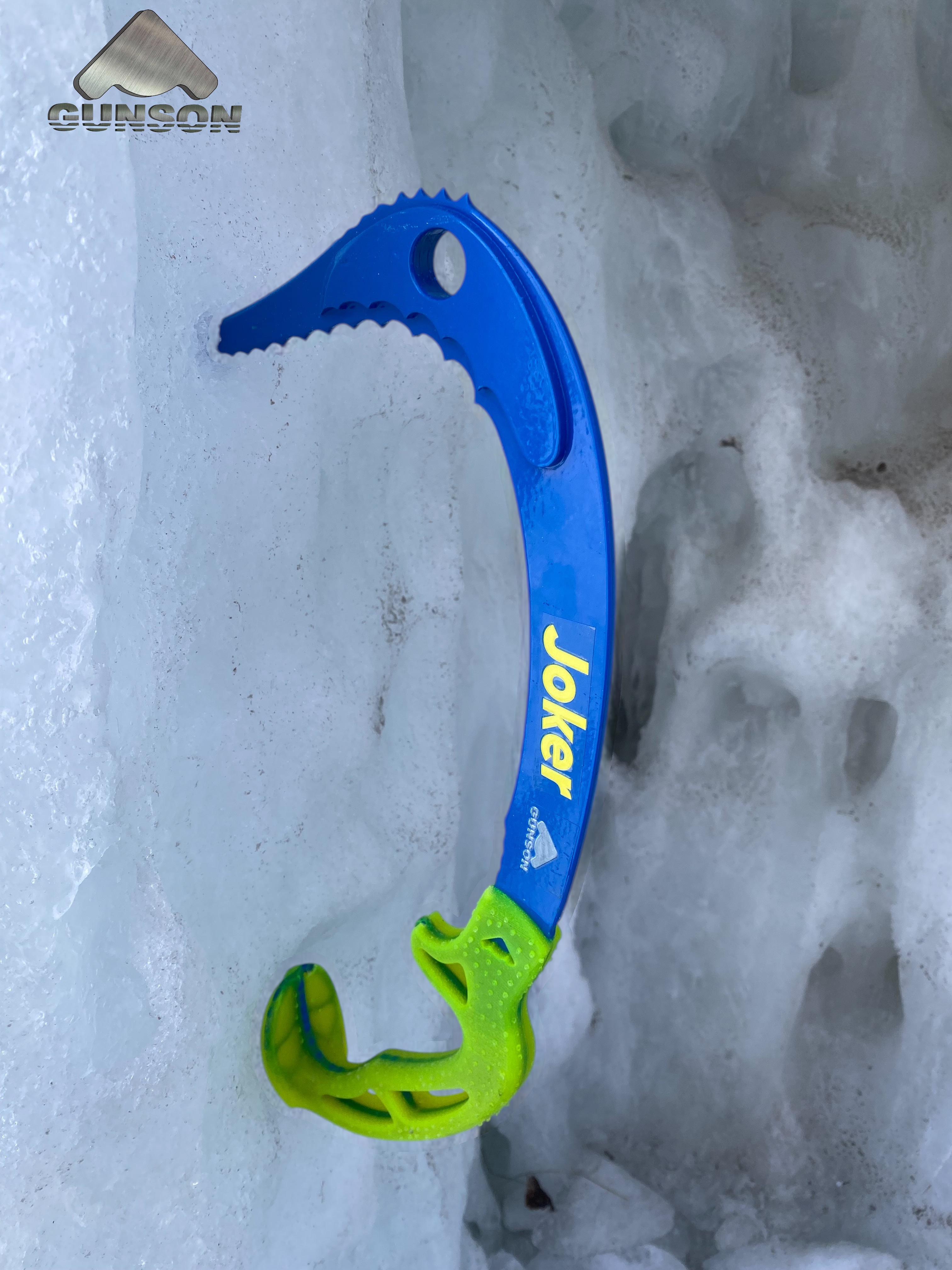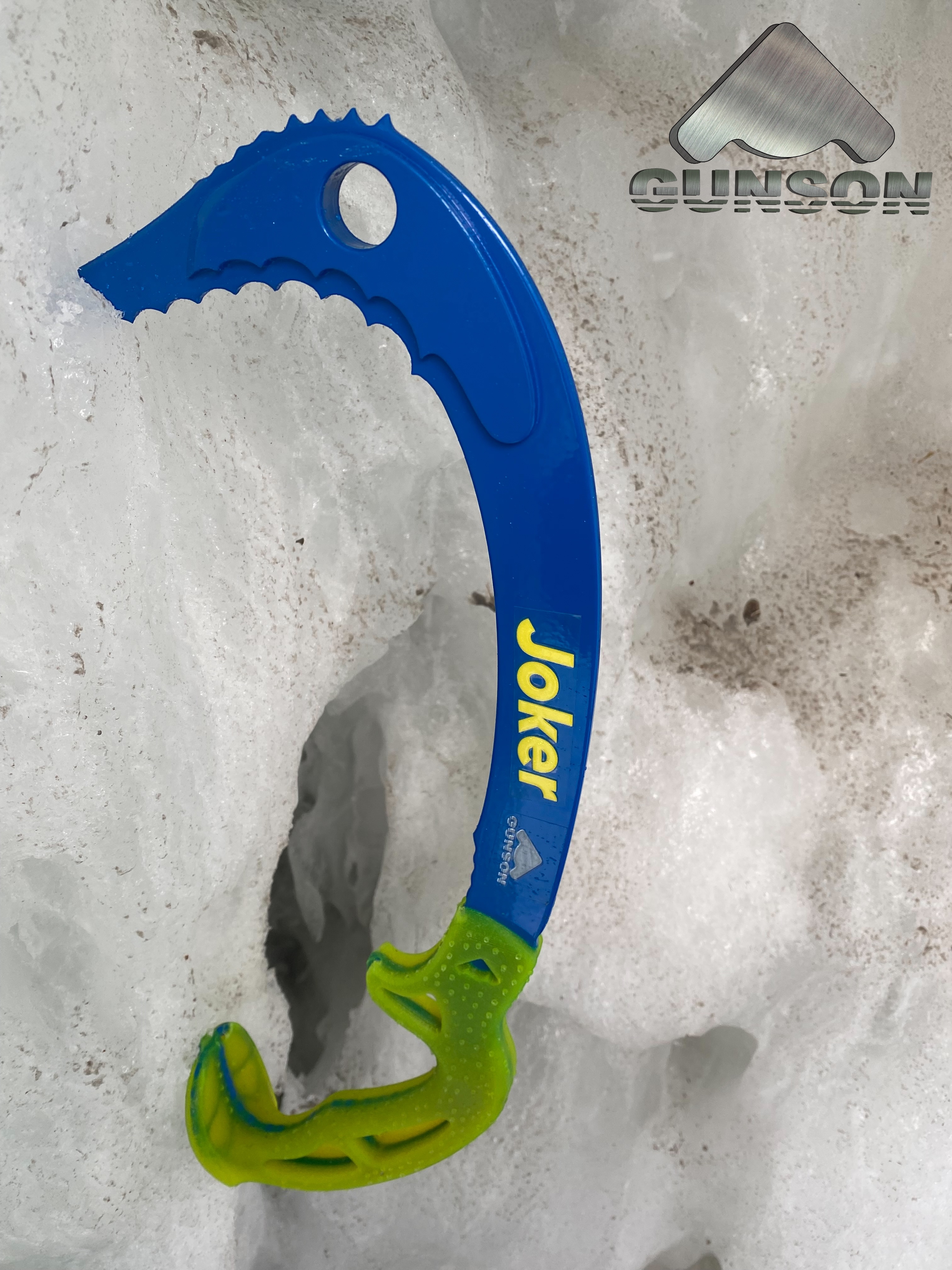 Joker является продолжением эволюции Kolyma на 23г. Этот инструмент сохранил основные преимущества Kolyma, которая многими альпинистами признана одним и лучших инструментов в мире для лазания по замерзшим водопадам, за счет небольших габаритов и веса, делает восхождение быстрым и приятным. Joker имеет свой, оптимизированный угол атаки клюва, улучшенную 6-ти граненую заточку клюва, увеличен вес на 24 грамма, все это придало Joker уникальные возможности для лазания по льду, на сегодня это лучший выбор для замерзших водопадов. Прекрасно подойдет для женщин и подростков не обладающих большой физической силой. Изготовлен из высокопрочной легированной стали 30ХГСА, толщина моноблока 4 мм, с боков клюва размещены щечки толщиной 4мм , которые прочно приварены к моноблоку, они предназначенные для придания жесткости клюву , увеличивают площадь опоры для удержания на рыхлом льду. На версии 26 года по верх головки добавлены зубчики для опоры на лед хватом за ручку, как во время лазания, также на этой версии металл окрашен в насыщенный синий цвет, делая инструмент заметным на фоне льда. Ручка выполнена из высокопрочного, ударостойкого полиуретана, армирована этим же металлом в области гарды, которая надежно защищает кисти рук от травм, ручка имеет анти-скользящее покрытие, цвета ручки разные. Прочность проушины на разрыв 20KN. Температура использования до t-50С. Длина 390 мм. Вес 536 гр.
