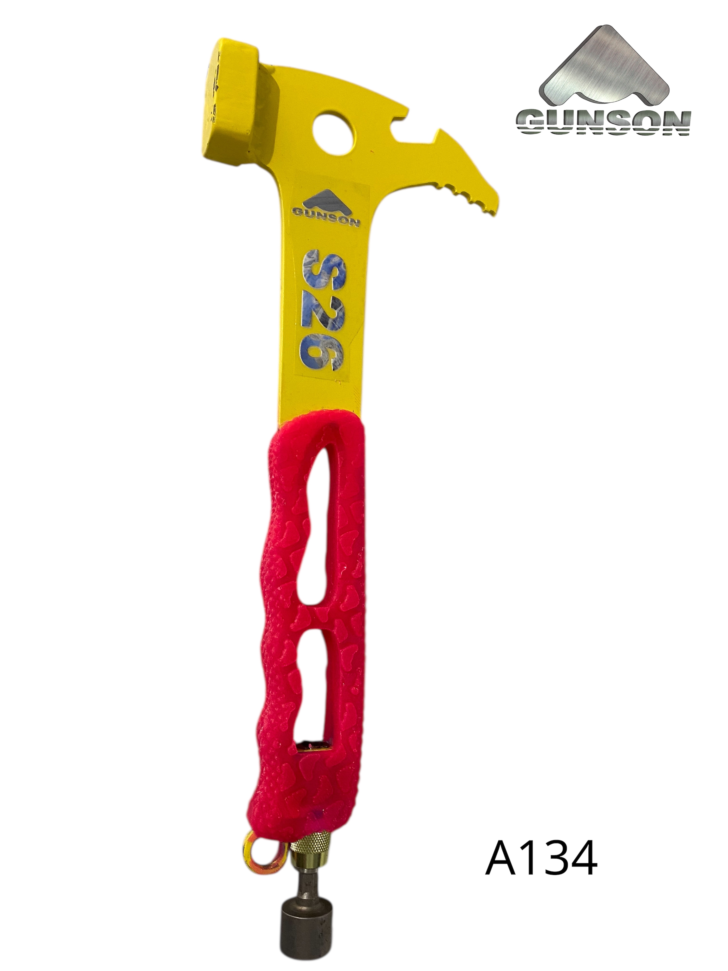 Молоток скальный S26 pro  , продолжение концепции  GUNSON - минимизации веса снаряжения стал легче на 10 граммов в области ручки, сохранив вес в ударной части молотка, все это ускоряет восхождение, делая его комфортным и более безопасным. Молоток  изготовлен из стали 30ХГСА , имеет не ограниченный температурный диапазон (-50С+50С). Молоток  весит 378 гр., длина  285мм. Клюв молотка S24 и S26 одинаковый, что позволяет выдергивать крючья боком ( 90% к плоскости крюка), вырез на клюве,  для гайки 13 mm, совмещен с вырезом для гайки на рапиде 9мм . Боек имеет конусную форму как у стоппера, может применяться  как полноценная точка страховки (к примеру на станции). На конце ручки имеется ухо для самостраховки D 10mm прочностью  10 kN. Ручка имеет увеличенный угол между плоскостью бойка, это предохраняет кисти рук от удара  по скале.  Ручка изготовлена из полиуретана, имеет ребристую поверхность, оригинальный орнамент  в виде логотипа Gunson,  яркий цвет, облегчающий поиск при утере. В ручку импортирован цанговый держатель для различного инструмента имеющий посадочный стандарт 1/4 дюйма. Теперь не надо носить шестигранник для Анкеров Gunson, не надо носить ключи для гаек, достаточно взять биту, конструкция цанги обеспечивает надежное крепление инструмента.  Молоток хорошо лежит в руке, ручка не скользит, не ломается на морозе  Отдельно возможно приобрести самостраховку  для   молотка  d 4-5мм.