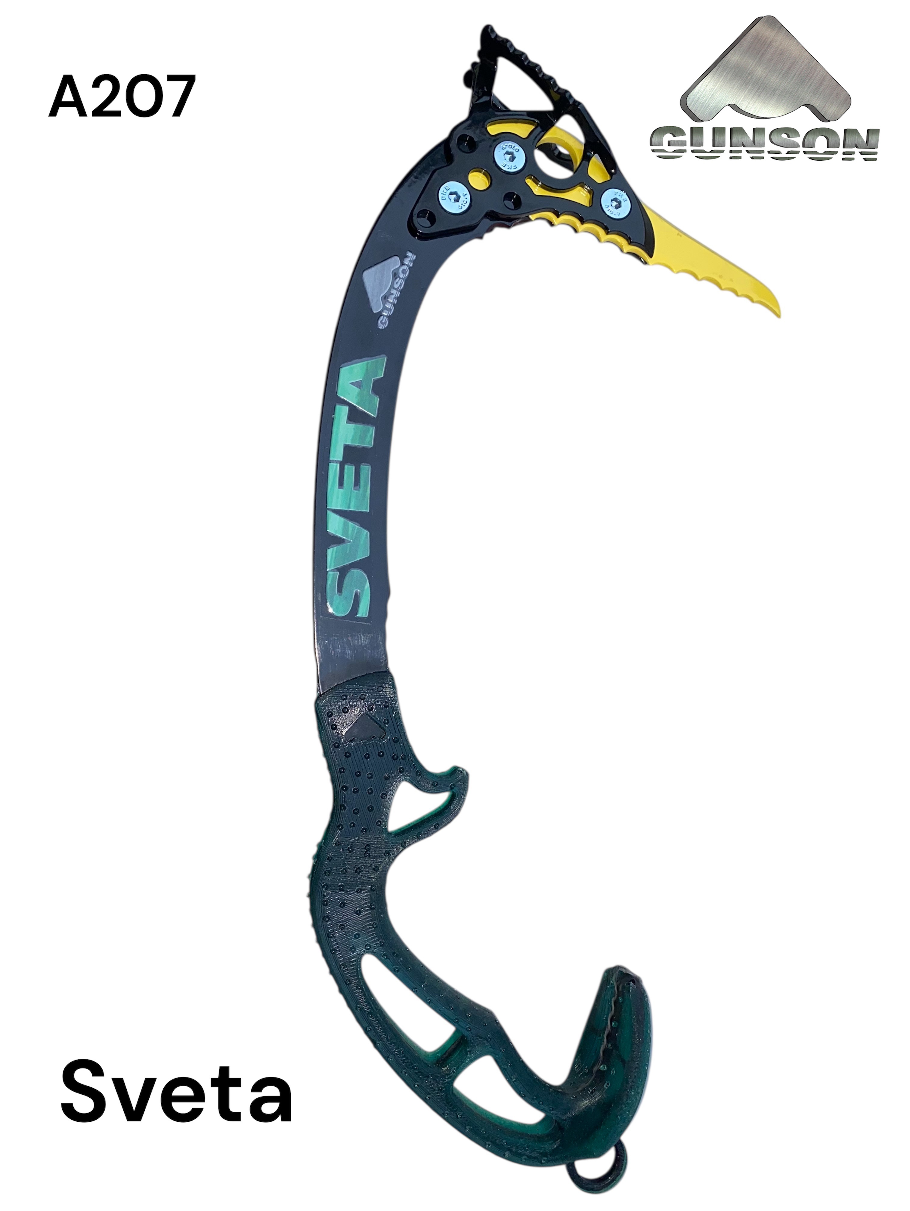 SVETA  более универсальный инструмент и подходит для зимнего льда, водопадов с ажурным льдом , ледяной корки, фирна . Дмитрий отметил, что инструменту Shaman не хватает крыльев, поэтому был сделан клюв c крыльями, который решал ряд задач.                                                                                                                              В дальнейшем боковые щеки SVETA приняли форму крыльев, как у Ice Tool Kolyma 20 года,  они увеличивают опорную площадь в 5 раз, делая возможным прохождение ажурного льда, крылья можно использовать для рубки льда, а так же для заклинивания в скальных трещинах.  Инструмент имеет вес 575 гр., Инструмент изготовлен из стали 30ХГС имеющий неограниченный температурный диапазон , клюв зажат между двумя сверхпрочными щеками на три болта с потайной головкой, с внутренним шестигранником  4мм, с другой стороны запрессованы три гайки М6 делающие боковые поверхности гладкими, исключая потерю гаек. Обращаю внимание порядок смены клюва, для этого необходимо открутить 3 винта М6 с внутренним шестигранником, сами винты затянуты, резьба стандартная , чтобы не сорвать шлиц  рекомендую использовать  высокопрочный шестигранник , исключающий смятие  граней, также необходимо очистить паз, и вставить шестигранник на полную длину, вращать шестигранник необходимо соосно с откручиваемым  винтам.  Общая длина инструмента осталась прежней 390 мм, это обеспечивает небольшую инерцию , позволяя работать незначительным замахом предплечья или только кистью руки.    Ручка изготовлена из армированного полиуретана, прочность уха на разрыв 20kN. Клюв Aggressive  рекомендую  для рельефа из льда и скал , для льда рекомендую клюв Gunson DIMA /SVETA  Ice / 57HRc/ t-30C/синий/ вес 75гр.                                                                                          Во время тестов при температуре -35С мне не удалось сломать или погнуть клюв, при этом для извлечения клюва я вращал ручку во всех направлениях.                      И последнее: Дмитрий был выдающийся спортсмен, гид и неординарный Человек !   Света - его спутница в жизни, и на многих восхождениях,  они любили друг друга,  и даже смерть не разлучила их.  Инструменты я посвятил памяти об  этих сильных людях.